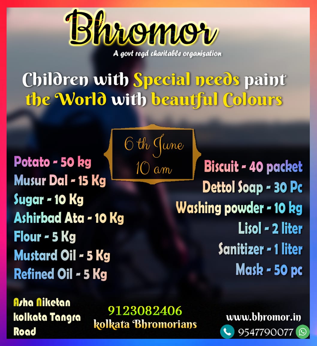 BHROMOR works in everywhere for help to helpless, also to improve the health condition of low-income people ,children, and the elderly by supplementing their food and other valuable things. So that, on this Amphan and covid pandemic situation BHROMOR went to ASHANIKETAN in Tangra to provide some food, medical kit, sanitizer,mask etc to the children. A great pleasure gifted us by the children with their dance, song etc. We spent the whole time with happiness.